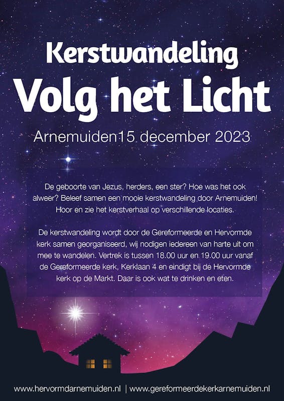 In Arnemuiden wordt 15 december een kerstwandeling georganiseerd. Wandel samen met je buren langs alle mooie locaties waar het kerstverhaal tot leven komt! Start tussen 18.00 en 19.00 uur bij de Gereformeerde Kerk in Arnemuiden.