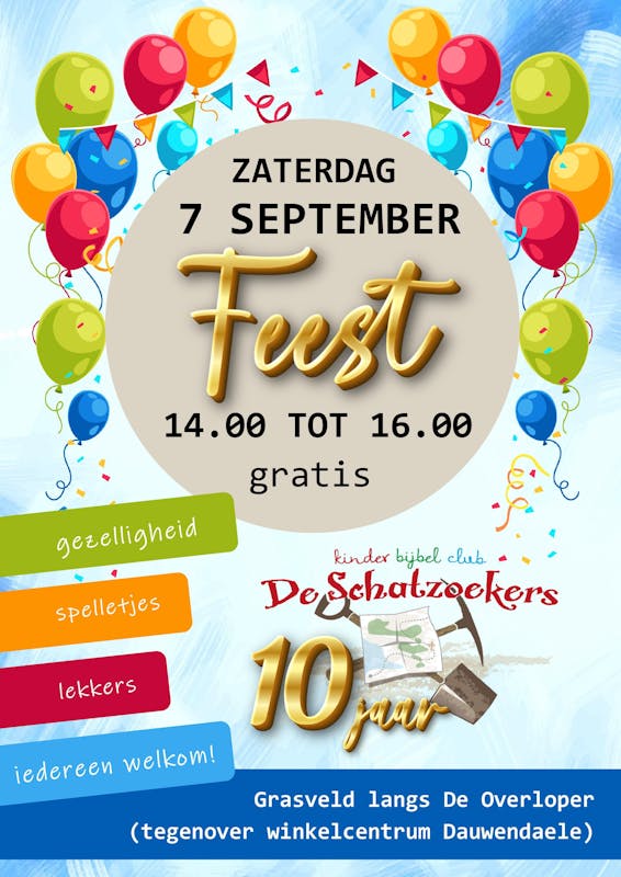Op zaterdag 7 september viert KinderBijbelClub De Schatzoekers haar 10-jarig bestaan! Alle kinderen (en ouders) van harte welkom tussen 14.00 en 16.00 uur op het grasveld langs De Overloper (tegenover Winkelcentrum Dauwendaele) om dit samen met ons te vieren.