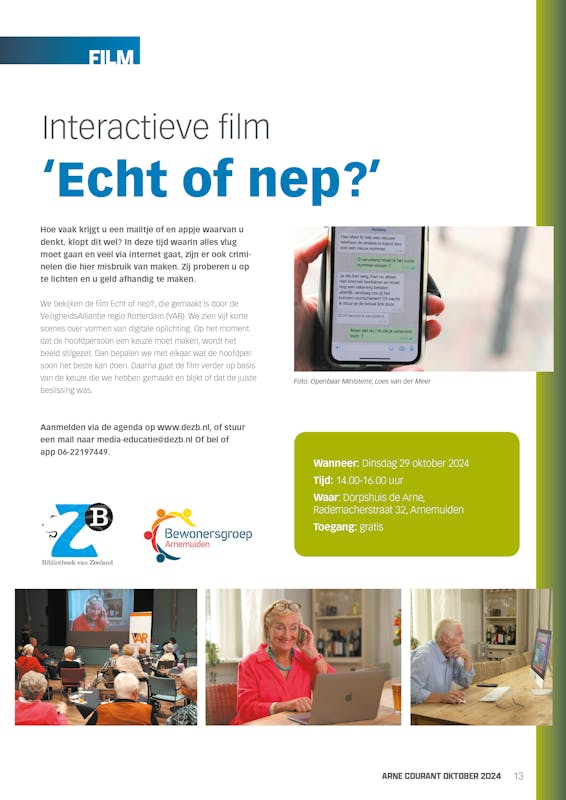 We bekijken de film Echt of nep?, die gemaakt is door de VeiligheidsAlliantie regio Rotterdam (VAR). We zien vijf korte scenes over vormen van digitale oplichting. Op het moment