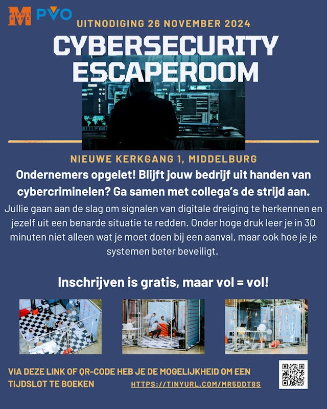 Platform veilig ondernemen en gemeente Middelburg nodigen je uit. Hoe goed is jouw bedrijf beschermd tegen cybercriminelen? Ontdek het in de unieke Cybersecurity Escaperoom op 26 november bij de Nieuwe Kerkgang 1 (ingang Jells) in Middelburg.