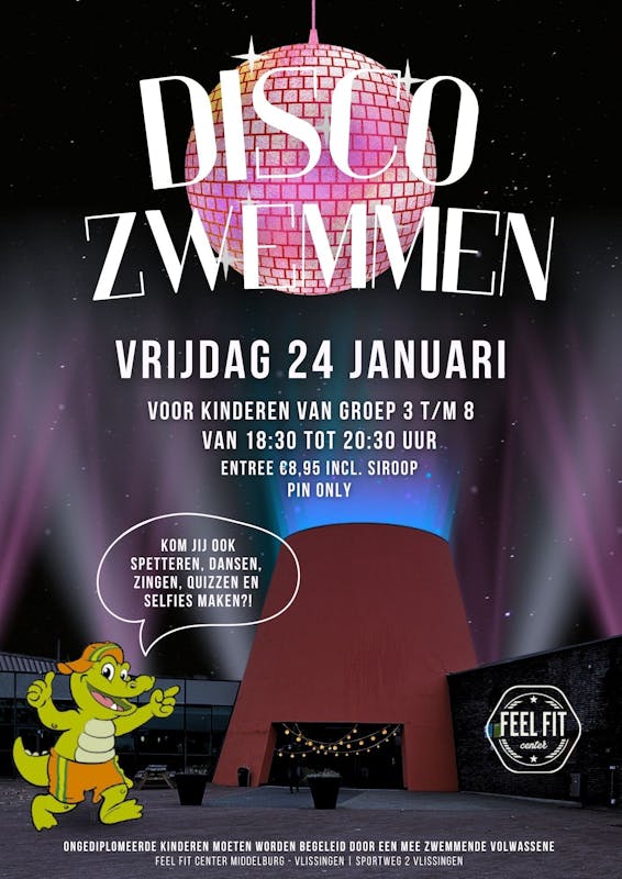 Hier bij Feel Fit Center Middelburg-Vlissingen (Voorheen Vrijburgbad) houden we van feestjes.🎉 Daarom organiseren we voor alle basisschoolkinderen van groep 3 tot en met 8 een zwemdisco🔮!