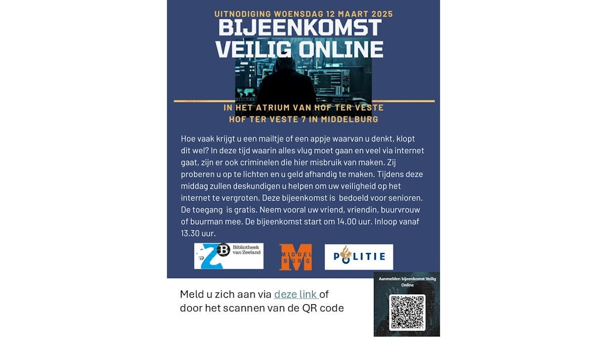 Hoe vaak krijgt u een mailtje of een appje waarvan u denkt, klopt dit wel? In deze tijd waarin alles vlug moet gaan en veel via internet gaat, zijn er ook criminelen die hier misbruik van maken. Zij proberen u op te lichten en u geld afhandig te maken. Tijdens deze middag zullen deskundigen u helpen om uw veiligheid op het internet te vergroten. Deze bijeenkomst is bedoeld voor senioren. De toegang is gratis. Neem vooral uw vriend, vriendin, buurvrouw of buurman mee. De bijeenkomst start om 14.00 uur. Inloop vanaf 13.30 uur.