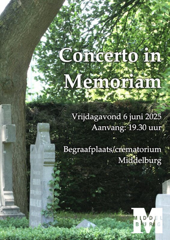 Op vrijdagavond 6 juni wordt er een ‘Concerto in Memoriam’ georganiseerd op de begraafplaats en crematorium aan de Westelijke Oude Havendijk in Middelburg. Dit openluchtconcert met als thema “Verbinding” geeft nabestaanden de gelegenheid hun overleden dierbaren te herdenken door middel van muziek. Dit jaar vindt het concert plaats op vrijdagavond 6 juni. Het concert begint om 19.30 uur en is vrij toegankelijk.