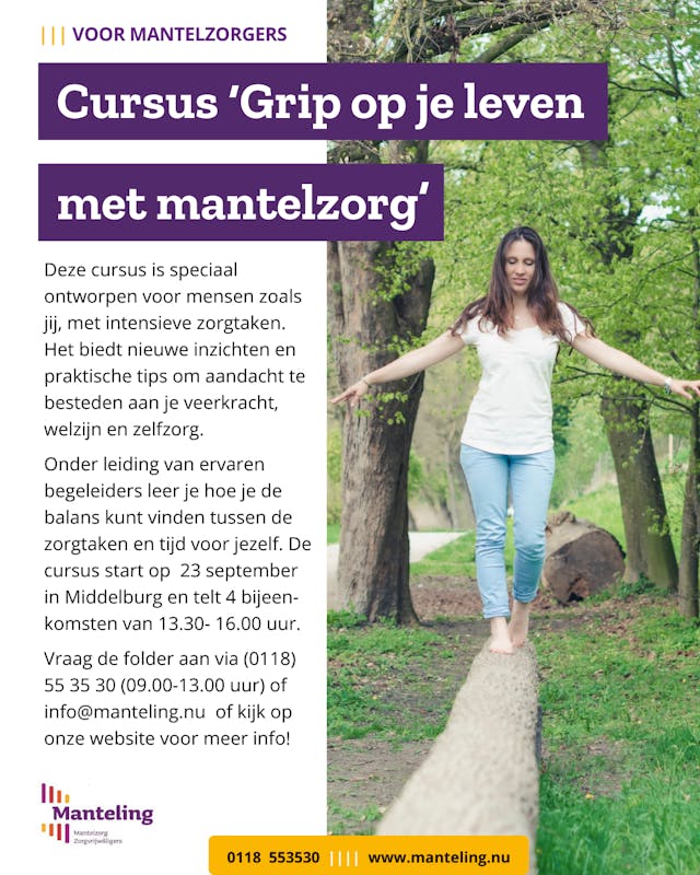 De cursus ‘Grip op je leven met mantelzorg‘ is speciaal ontworpen voor mantelzorgers met intensieve zorgtaken. Deze cursus biedt nieuwe inzichten en praktische tips om aandacht te blijven besteden aan je veerkracht, welzijn en zelfzorg. Zo kun je de balans vinden tussen je zorgtaken en tijd voor jezelf.