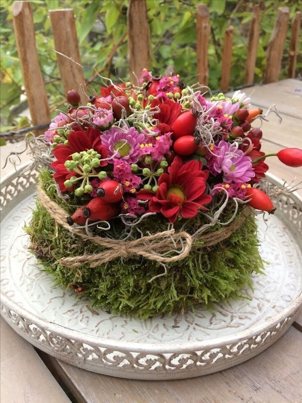 Onder leiding van Ursula Muller van Atelier Bloemfantasie ga je aan de slag om een herfst mostaartje met bloemen te maken. Jij kunt zelf kiezen welke bloemen en decoraties je wilt gebruiken uit het aanwezige materiaal.