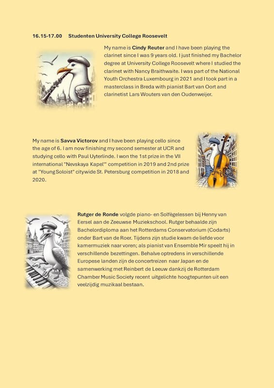 De dag begint ’s ochtends met het D-examen van Myriam Paans voor de Muziekschool. In de middag kunt u genieten van diverse concerten. In het programma (zie bijlage) leest u welke musici optreden en wanneer.