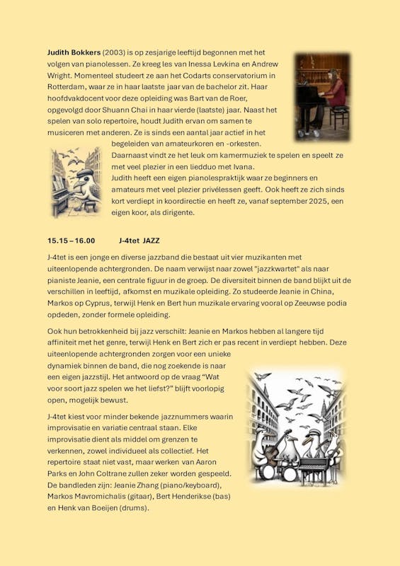 U bent van harte welkom om één of meerdere concerten bij te wonen – of natuurlijk om de hele dag aanwezig te zijn. Tussen de optredens door is er alle ruimte om elkaar te ontmoeten en te genieten van een hapje en een drankje.
