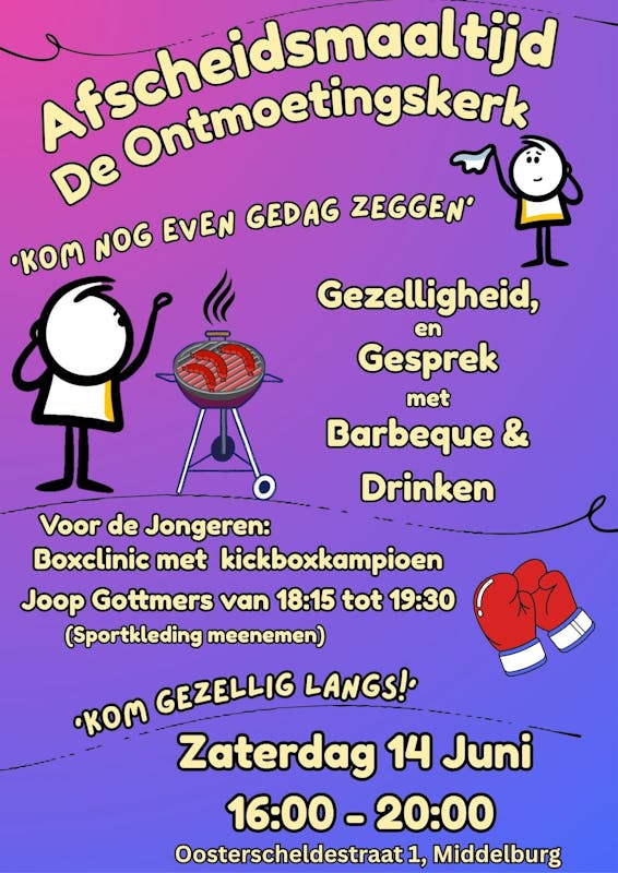 Welkom bij een ontspannen afscheidsmaaltijd van de Ontmoetingskerk voor de wijk om de kerk heen. Wij vertrekken uit deze mooie wijk, maar willen dat graag op een fijne manier doen. Lekkere broodjes hamburger en saté en gezelligheid op het plein voor de kerk.