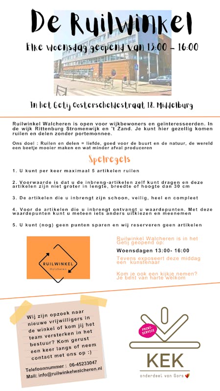 Wij zijn sinds oktober 2024 elke woensdag geopend van 13.00 tot 16.00 voor wijkbewoners en geïnteresseerden in de wijk Rittenburg Stromenwijk en 't Zand. Er zijn elke woensdag vrijwilligers die graag uitleggen hoe de Ruilwinkel werkt. Je kunt hier gezellig komen ruilen en delen zonder portemonnee.  Ons doel : Ruilen en delen = liefde, goed voor de buurt en de natuur, de wereld een beetje mooier maken eventueel met watertje of een bakje koffie erbij.