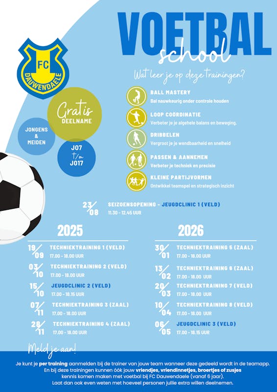 Welkom bij FCD Voetbalschool! Bereid je voor op toffe techniektrainingen en clinics voor de jeugd (t/m JO17). Onze getalenteerde trainers en spelers van het 1e elftal leren jou alle skills, tips en tricks om je vaardigheden naar een hoger niveau te tillen!