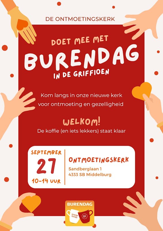 Ook de ontmoetingskerk doet mee met burendag! Onze nieuwe kerk staat voor u open. Dus kom gezellig langs om elkaar en de buurt te ontmoeten bij een kop koffie en wat lekkers!