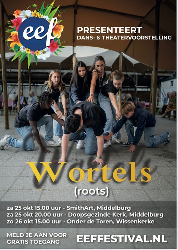 In Wortels gaan jongeren met diverse culturele achtergronden op zoek naar de verhalen en patronen die generaties met elkaar verbinden. Met spel, dans, beweging en live muziek graven zij naar wat verborgen is. Soms raken ze verstrikt. Soms ontdekken ze onverwachte lijnen tussen verleden en heden. Soms blijkt één wortel een heel bos te voeden.
