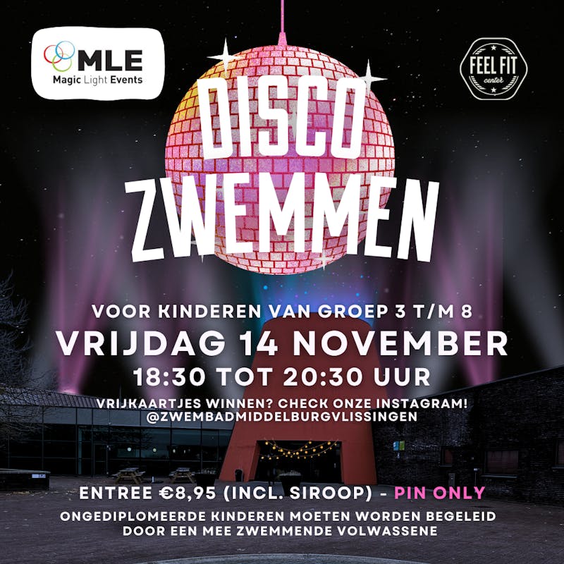 Alle basisschoolkinderen (groep 3t/m8) kunnen komen zwemmen, spelen en dansen op de beats van Magic light events.