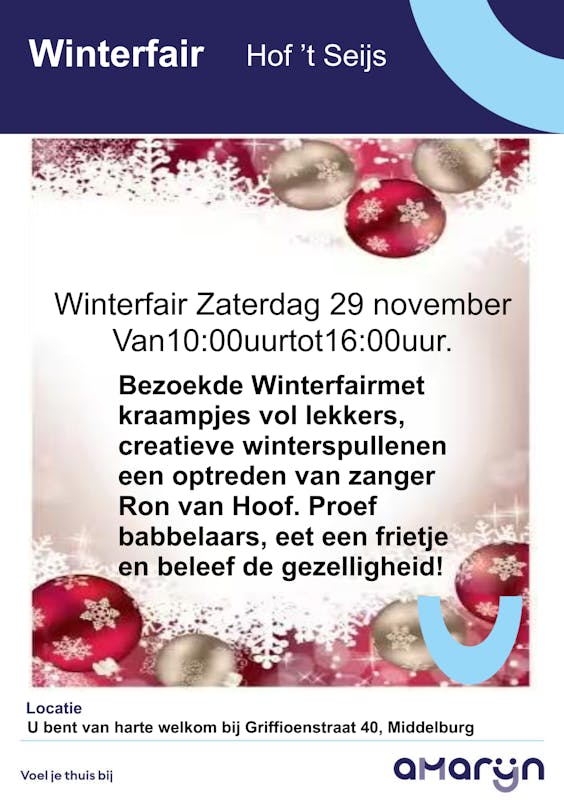 Bezoek de Winterfair met kraampjes vol lekkers, creatieve winterspullen en een optreden van zanger Ron van Hoof. Proef babbelaars, eet een frietje en beleef de gezelligheid