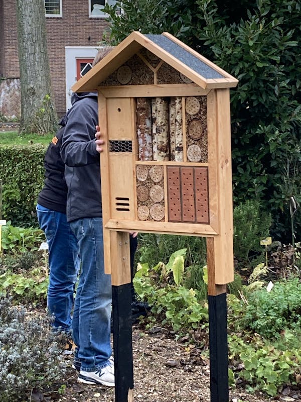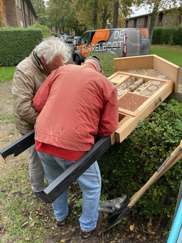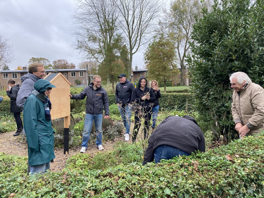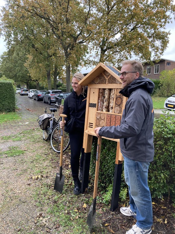 In de Bomenbuurt in de Griffioen, was er afgelopen woensdag een feestje. De buurt kreeg bloembollen en een bijenhotel cadeau. Er worden de komende tijd veel bollen geplant, dit is een mooie samenwerking van Woongoed en de gemeente. Ook heeft Woongoed een prachtig bijenhotel geschonken aan de buurt op deze feestelijk dag. De buurt kreeg het bijenhotel omdat ze dit jaar tot 'parel van de wijk', zijn gekozen door Woongoed. De bomenbuurt heeft een groep actieve bewoners die zich dagelijks inzetten voor hun buurt. U kunt het bijenhotel bewonderen in de kruidentuin. Buurtbewoners trotseerden de regen en kregen heerlijke koffie met gebak en natuurlijk een zakje met bollen.