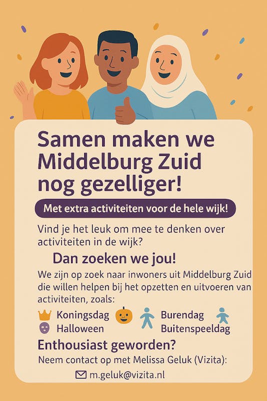 We zijn op zoek naar enthousiaste inwoners uit Middelburg Zuid die willen helpen bij het opzetten en uitvoeren van activiteiten, zoals: