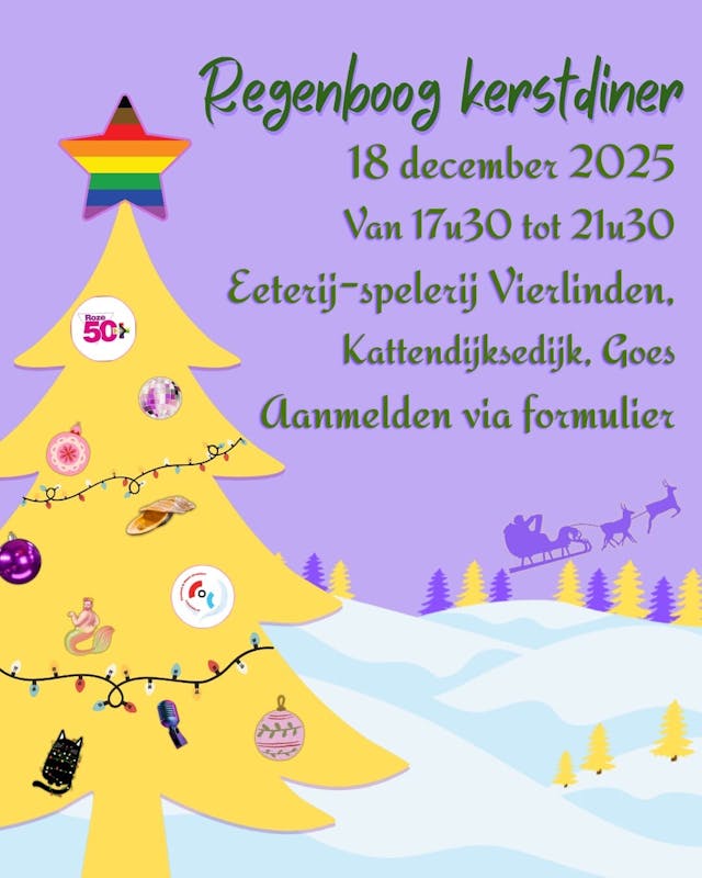 Op donderdag 18 december organiseren Roze 50+ Zeeland en COC Zeeland & West-Brabant weer en Regenboog Kerstdiner. Kosten €17,50 p.p. Info en aanmelden: https://coczwb.nl/agenda/18-12-2025-regenboog-kerstdiner