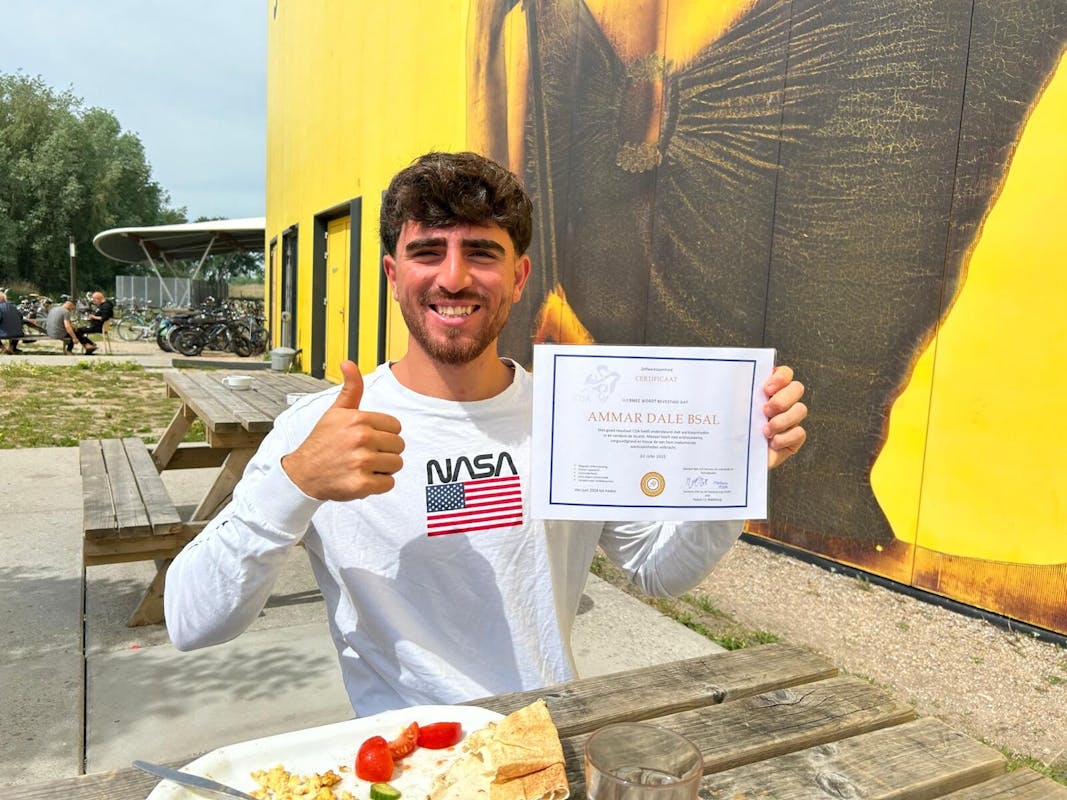 اليوم، حصلت على شهادة الاعتماد على الذات من الوكالة المركزية لاستقبال طالبي اللجوء (COA) تقديراً لعملي التطوعي في المخيم A58 في ميدلبورغ.