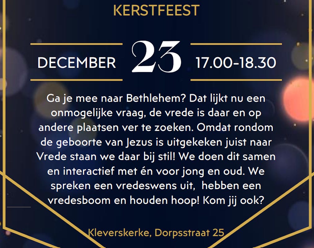 Zaterdag 23 December van 17.00-18.30 Omdat we elke dag horen over oorlog staan we stil bij Vrede. Dat doen we samen met jong en oud. Iedereen is welkom, er zijn Oosterse hapjes en drankjes! Bekijk de foto's van vorig jaar voor een idee.