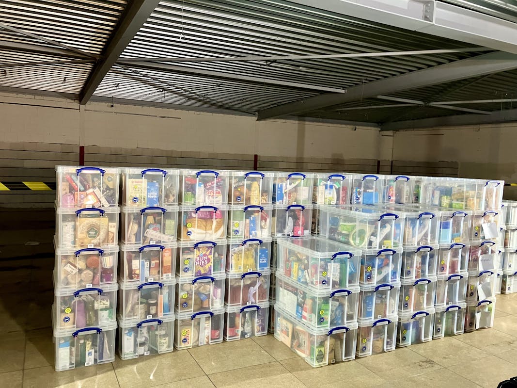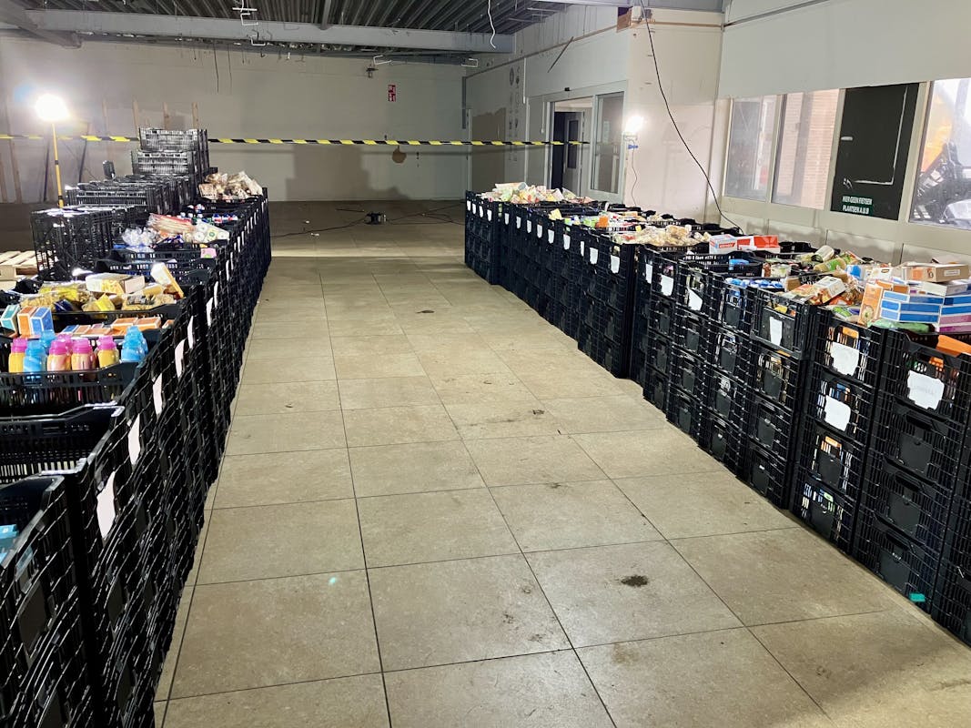 De producten worden verdeeld over de zwarte kratjes in de ‘verdeelstraat.’ Elk product gaat in een eigen zwarte krat. Van daaruit worden ‘basisboxen’ samengesteld, voor elk gezin een box.