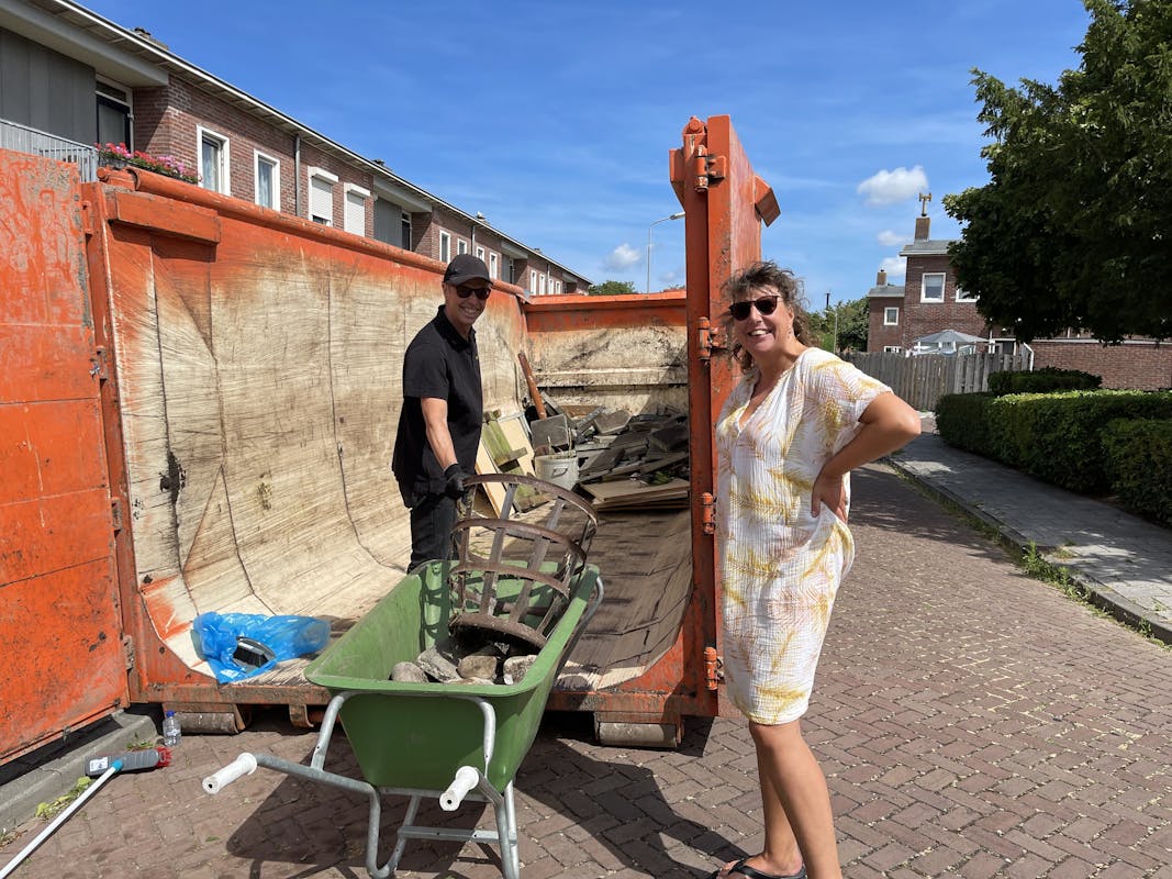 Miriam heeft een fijne tuin in de Oostgatstraat maar het onderhoud breekt haar, vanwege zware rugklachten, op. “Zittend op krukje kan ik wat onkruid verwijderen, maar dat houd ik niet lang vol.” De Woongoeddag waarbij medewerkers van Woongoed en Orionis de mensen helpen met hun overbodige spullen en tuinen opknappen komt voor haar als geroepen. “Eigenlijk zou het fijn zijn als dit halfjaarlijks gebeurd. Ik heb geen mensen om mij heen die kunnen helpen. Ze hebben het allemaal druk. Maar als je nu kijkt dan knapt het weer mooi op. En al het vuil wordt afgevoerd. Hier ben ik blij mee.”