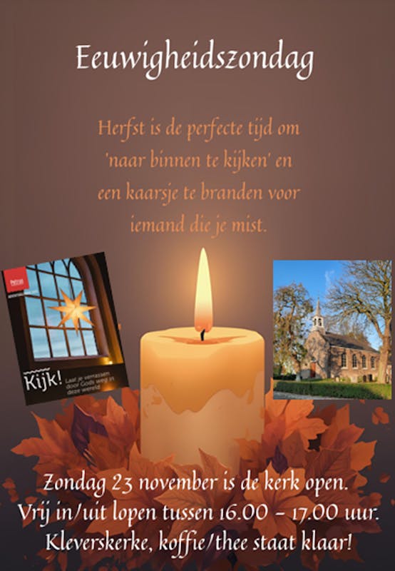 De kerk is 23 november weer een uurtje extra open. Vrij in- en uit lopen tussen 16 - 17 uur om een kaarsje te branden. Kom gerust, wie weet ontmoet je ook andere dorpsgenoten!