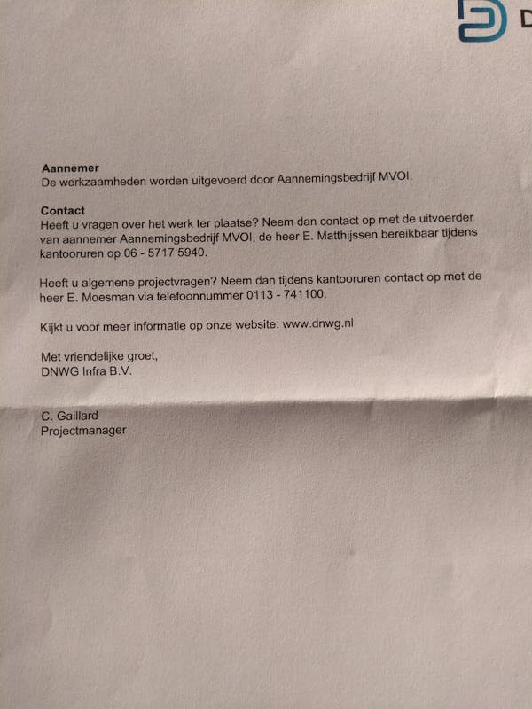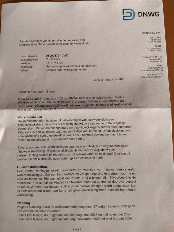 In de week van 21 augustus 2023 zal DNWG Infra BV in opdracht van Evides Water N.V. en Stedin Netbeheer B.V. starten in Kleverskerke met het vervangen van de waterleiding en electriciteitskabels. De totale werkzaamheden duren ongeveer 27 weken. Dick wil wel fungeren als contactpersoon voor eventuele vragen of klachten. De heer Matthijssen is de uitvoerder en is te bereiken onder telefoonnummer 06-57175940. Algemene vragen kunnen gesteld worden aan de heer Moesman, telefoon 0113-741100.